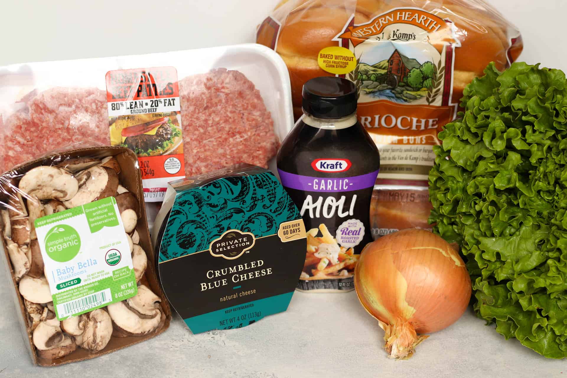- Top each hamburger bun with garlic aioli, lettuce, a hamburger, sautéed mushrooms and onions, and bleu cheese crumbles.