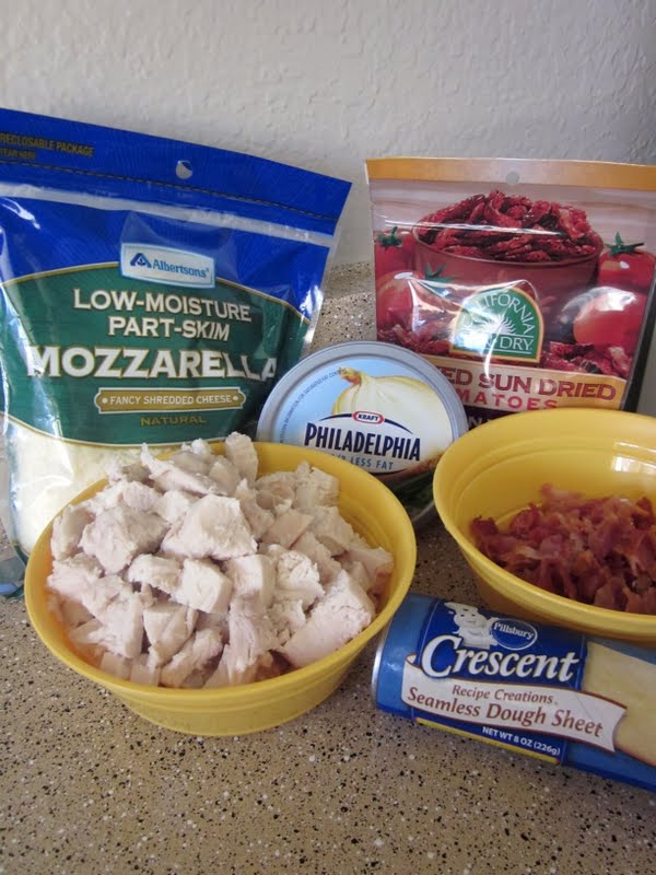 First, mix the cream cheese, mozzarella cheese, chicken, bacon, and sun dried tomatoes together in a bowl until combined. Then set aside.