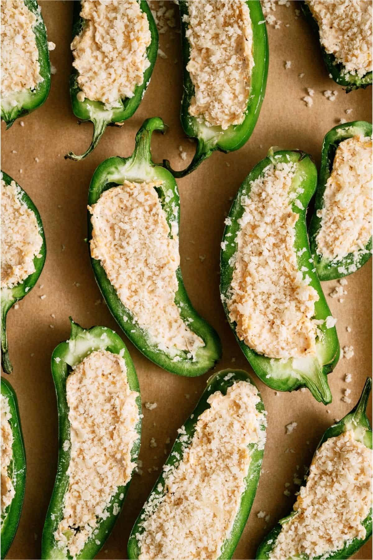 - Top the jalapenos with panko breadcrumbs and drizzle with olive oil.