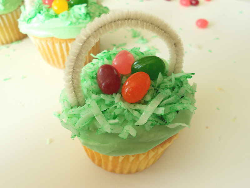- Decorate your Cupcakes by spreading on frosting, topping it with coconut and jelly beans, then adding your pipe cleaner basket holder.