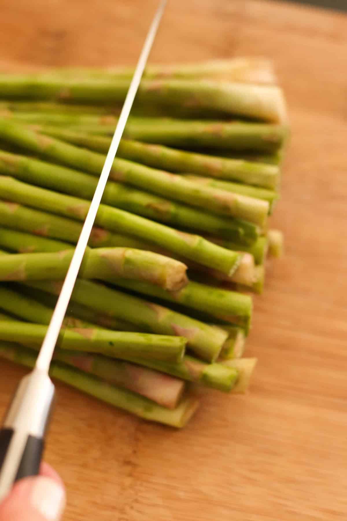 - Spread fresh asparagus (make sure to trim off the woody ends off the bunch of asparagus and rinse in cold water) on a rimmed baking sheet in a single layer.