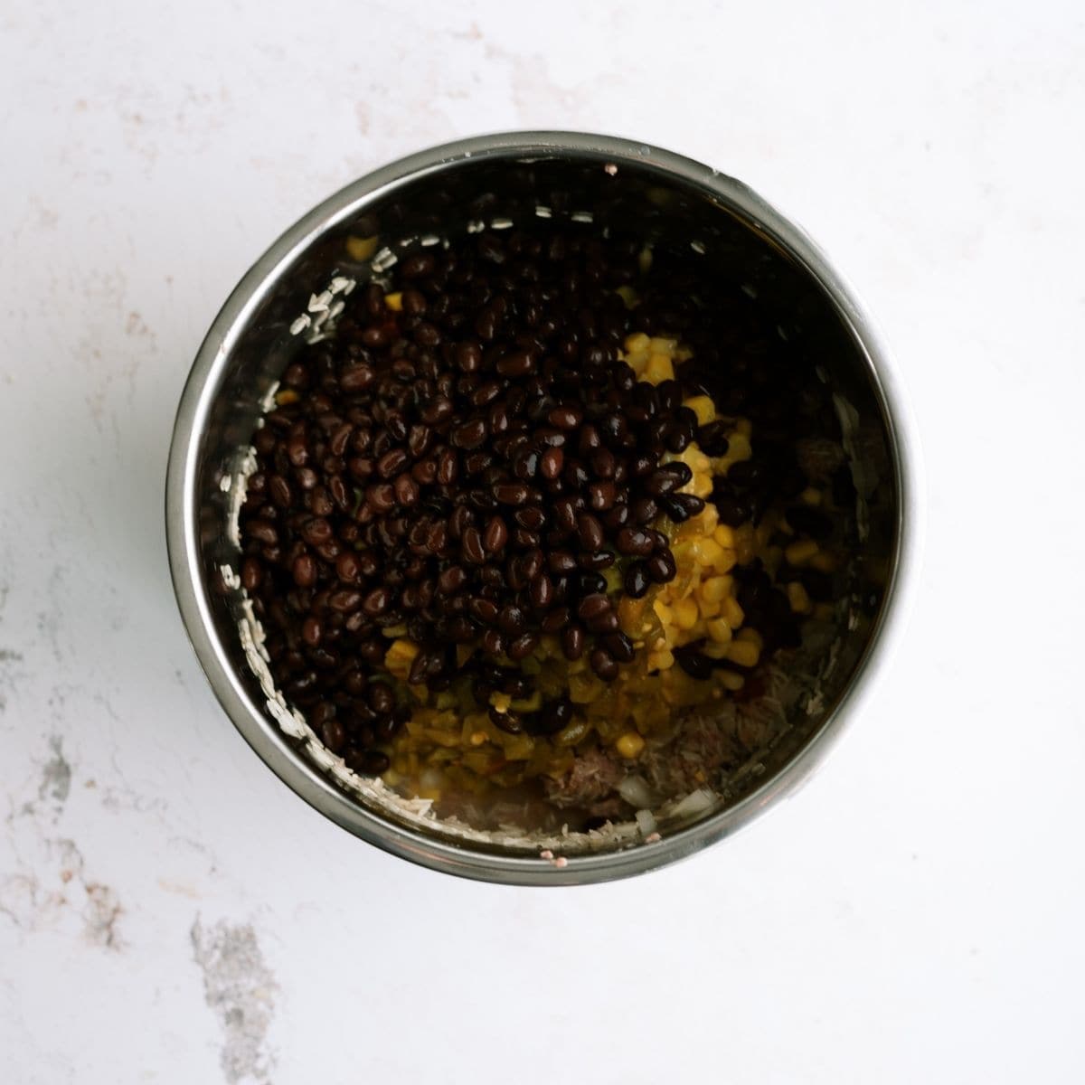 - Next, dump in the salsa, can of undrained corn, can of undrained green chilies, drained and rinsed black beans, and the taco seasoning mix. No need to stir it yet.