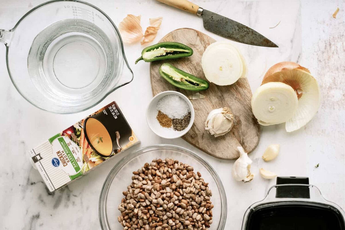 - Place the onion, rinsed beans, jalapeno, garlic, salt, pepper, and cumin into the liner of the Instant Pot.