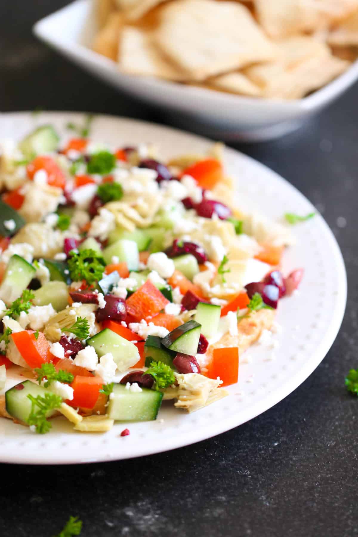 - Spread the Greek yogurt carefully over the top, then sprinkle red pepper, olives, cucumber, artichoke hearts, and feta cheese.
