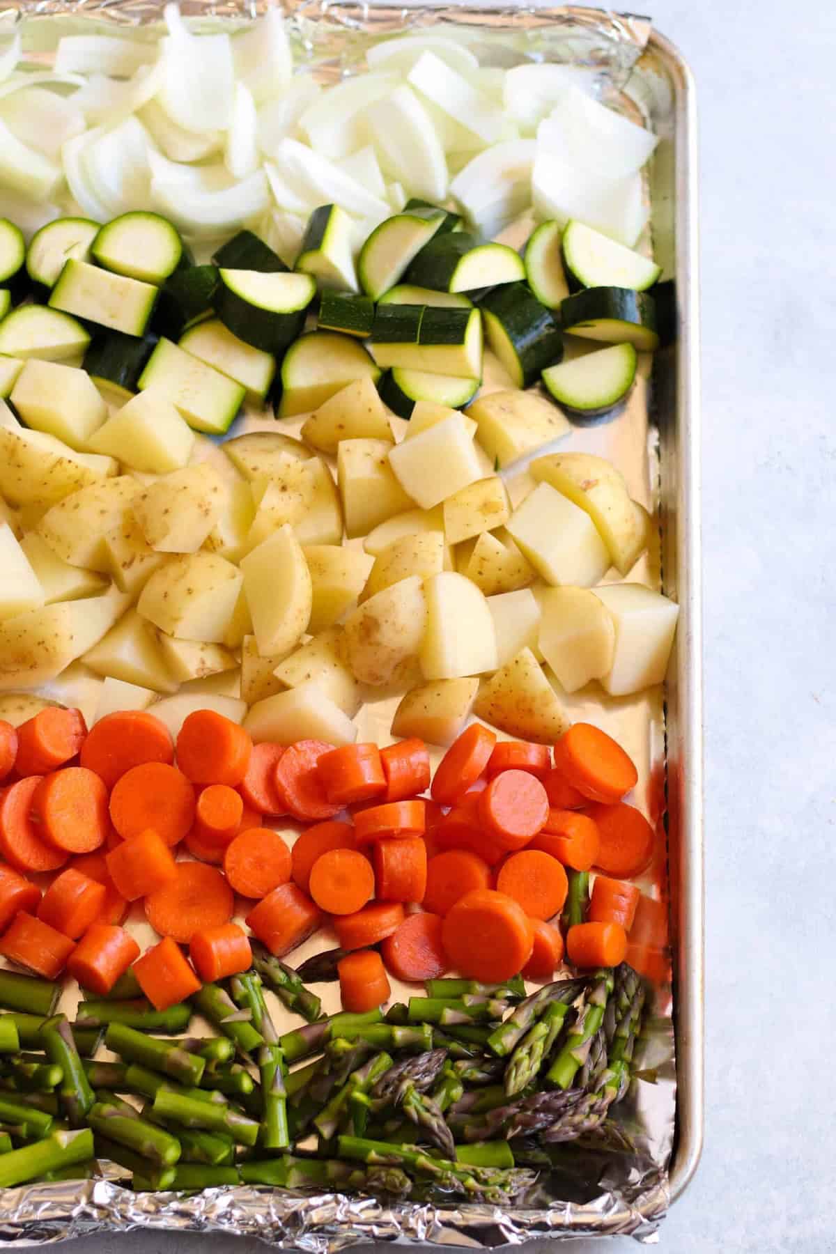 - Spread potatoes, carrots, onion, zucchini and asparagus in an even layer on prepared baking sheet.