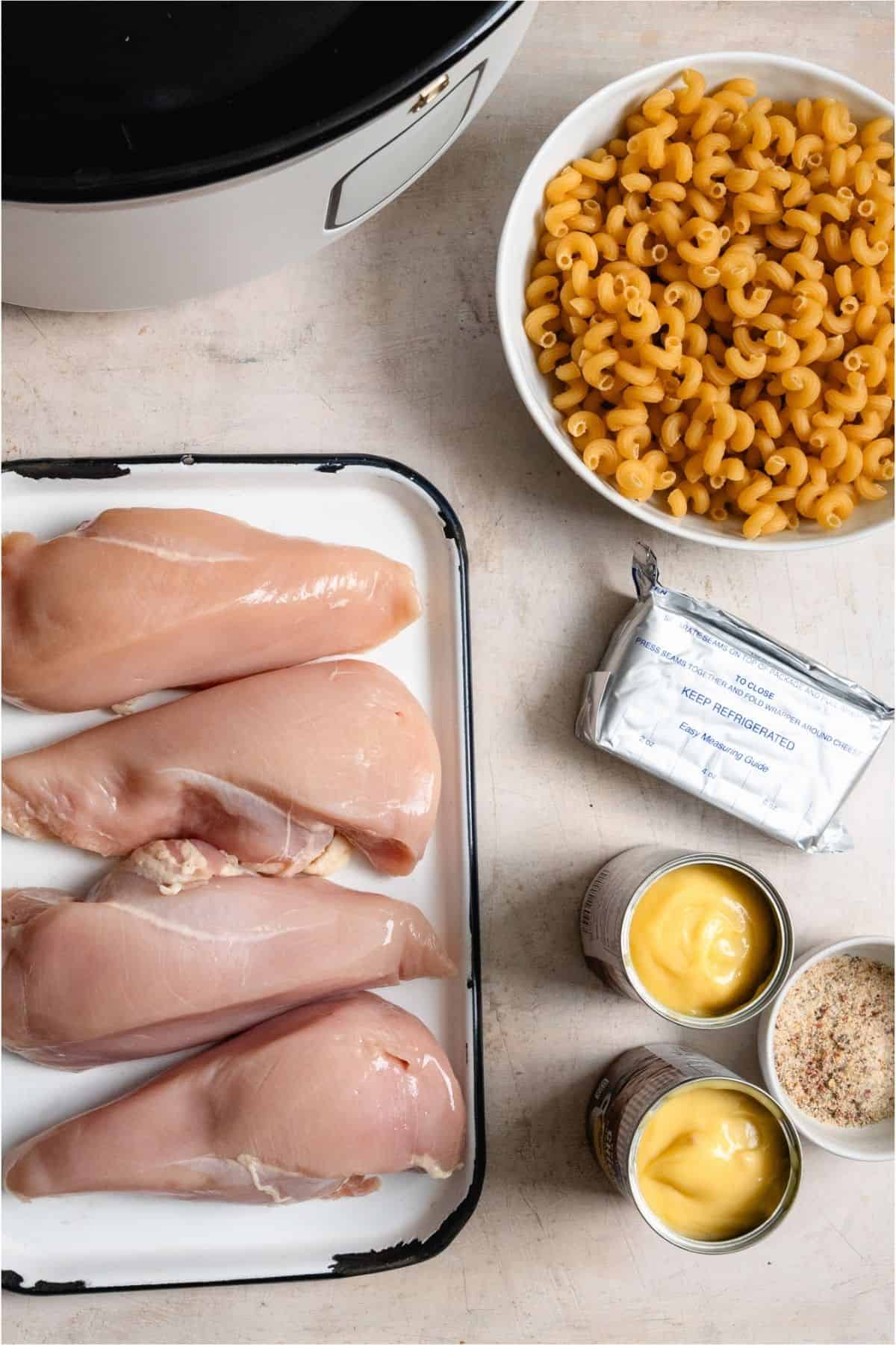Boneless, skinless chicken breasts are our go-to protein choice for this slow cooker recipe, but you can also use chicken thighs.