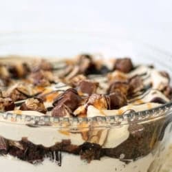 I love serving this trifle at family and friend gatherings. It doesn’t get much easier or delicious than this Snickers brownie trifle.It tastes like a Snicker’s bar was made into a delicious fluffy and creamy dessert, that you won’t be able to stop eating.