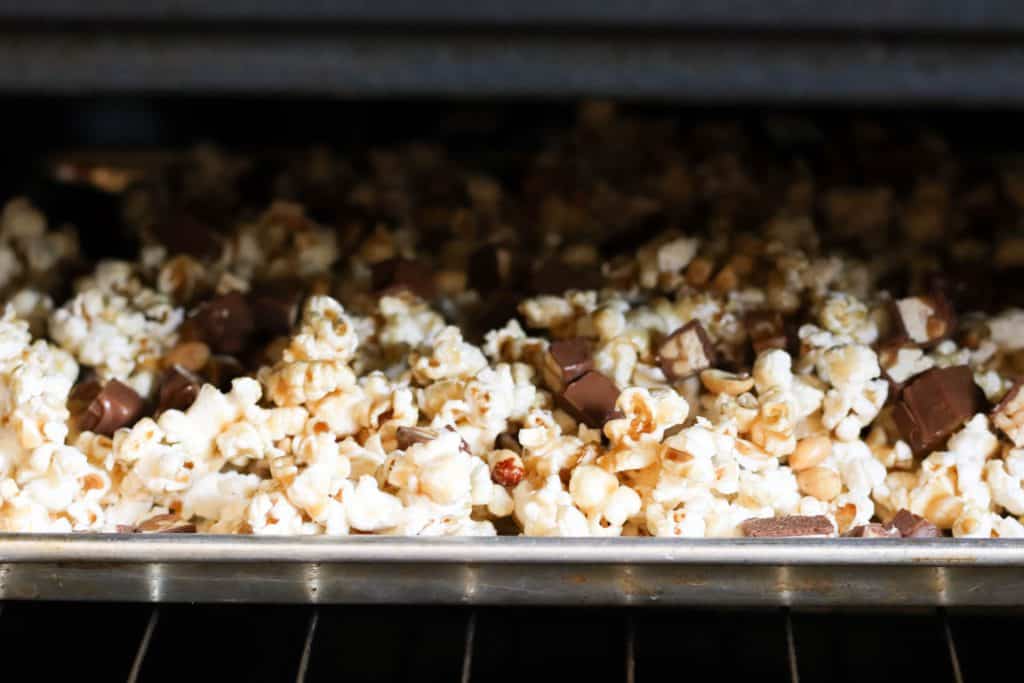 - Remove from the oven and drizzle melted chocolate over top of popcorn.