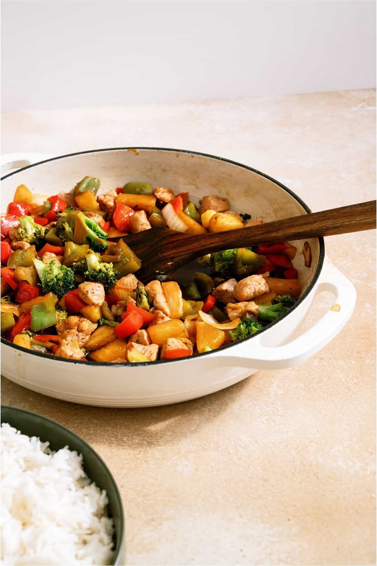 - Add broccoli, pineapple, peppers and onion and cook for 6-8 minutes, or until tender.
