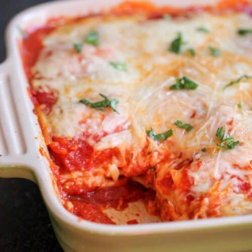 All the flavor of homemade lasagna with a loss less work! This cheesy, 5-ingredient Ravioli Lasagna Recipe is delicious!