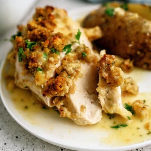 We love to serve it with baked potatoes and use the extra soup mix as a gravy to go on top. Another thing I like to do is top each chicken breast with a slice of cheese (cheddar, Swiss, Provolone- they are all delicious!). Some people also said that they like to add sour cream to their soup mixture for an additional twist.